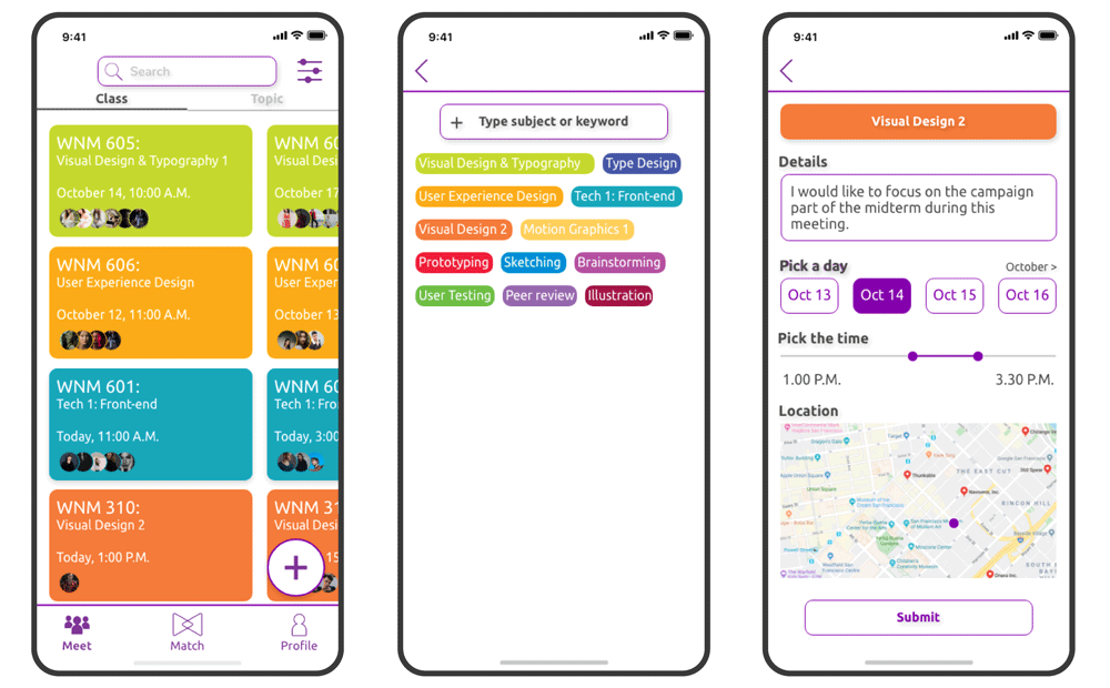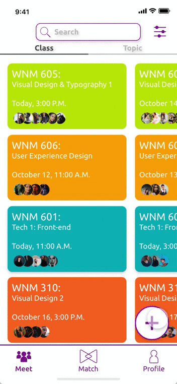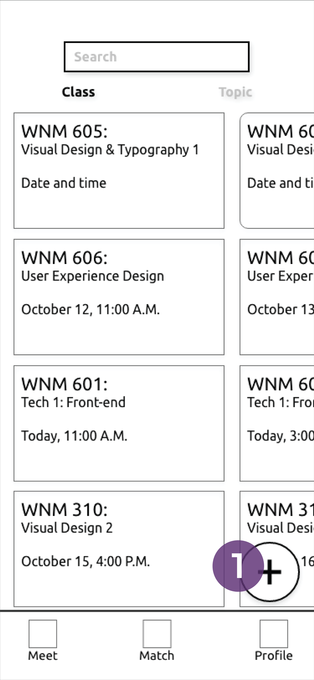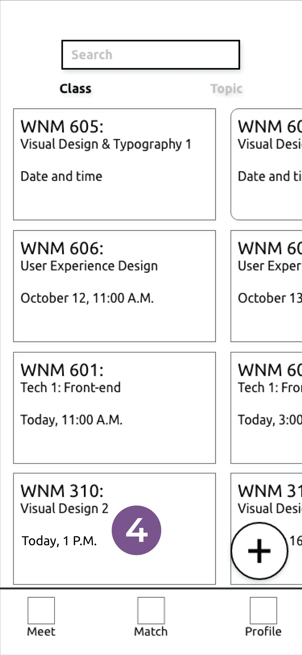 Looking for already scheduled workshops and meeting with other students, with different time options for every class. Otherwise, posting a new meeting with a specifying topic, any extra detail, timing and location.