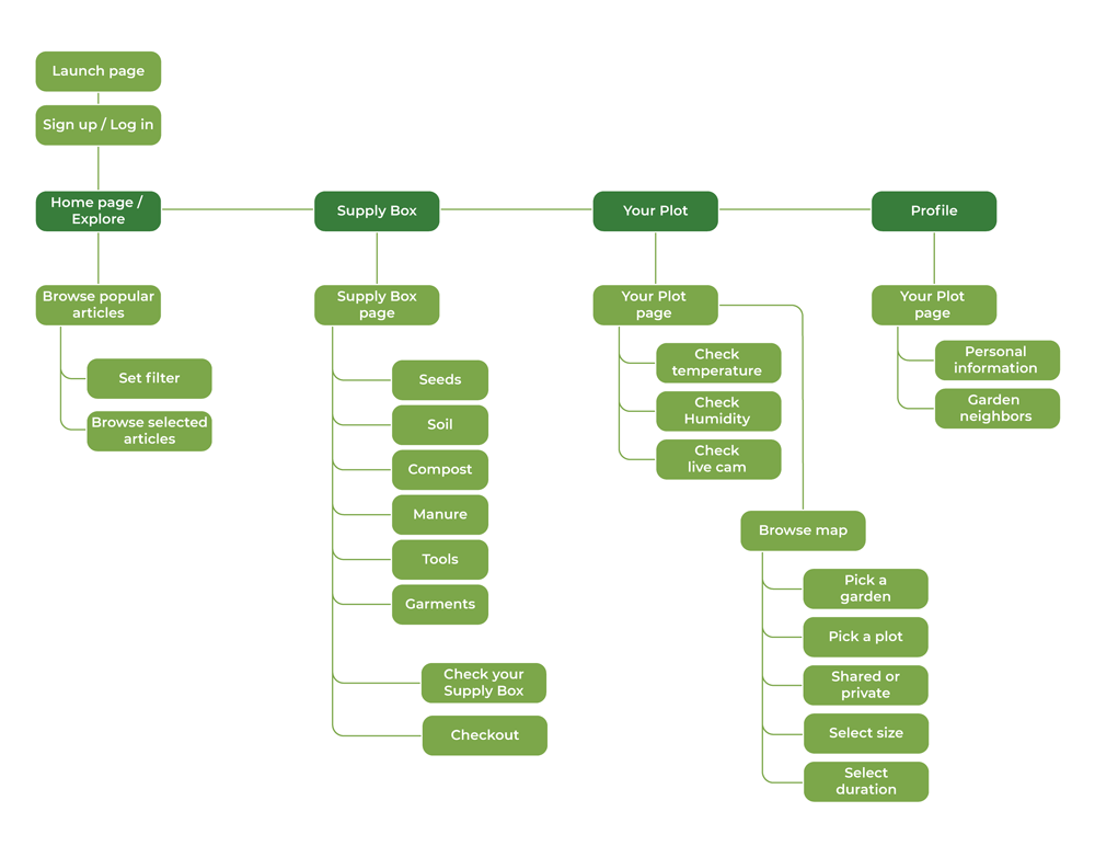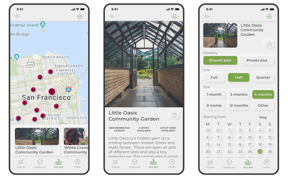 Giving a new purpose to unused space like rooftops or neglected backyards, creating common green areas for community gardens. A survival kit to start gardening with essential tools and seeds. An app to learn about plant requirements and to schedule time and request spaces in communal gardens.